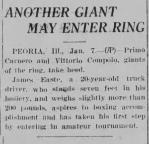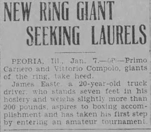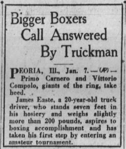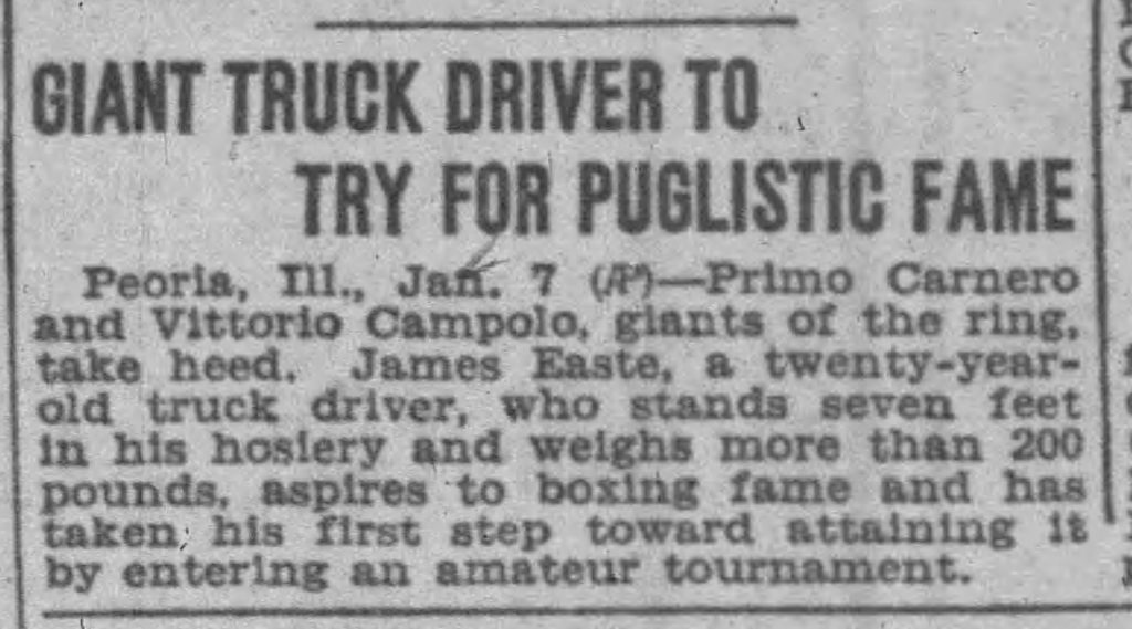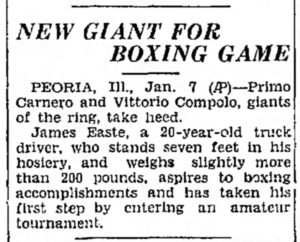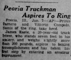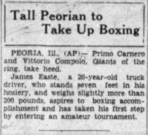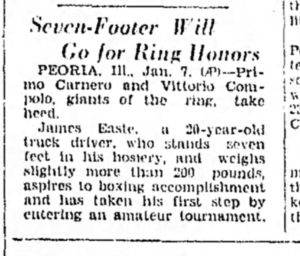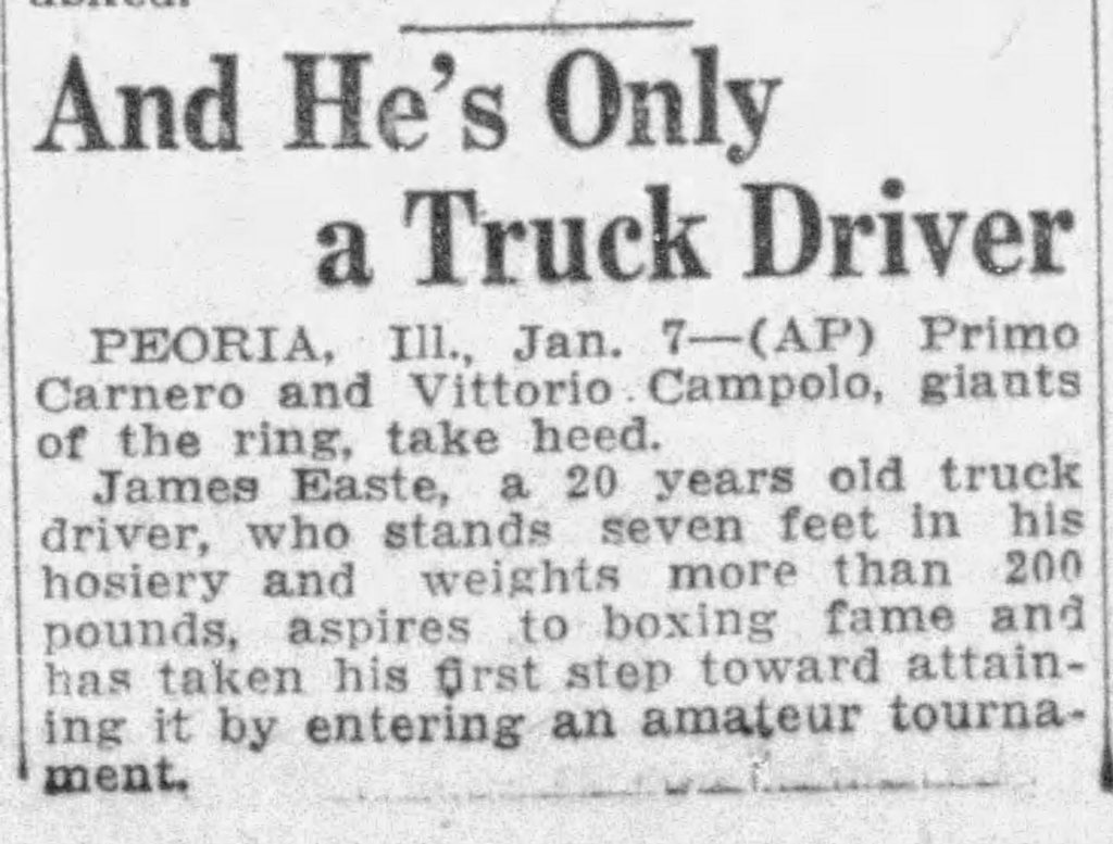 It reads: “Seven Footer in Peoria, MIT Show, Primo Carnero and Vittorio Compolo, giants of the ring take heed. James Easte, a 20-year-old truck driver who stands seven feet in his hosiery and weighs slightly more than 200 pounds, aspires to boxing accomplishment and has taken his first step by entering an amateur tournament.”
