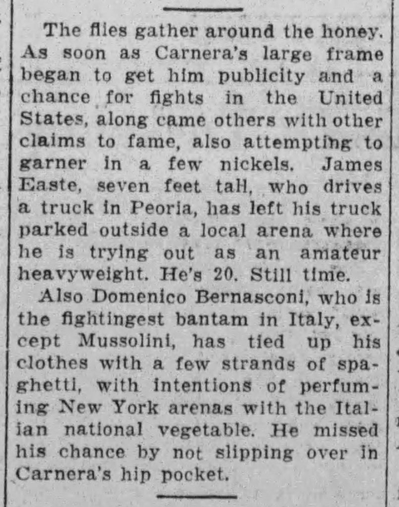 “The flies gather around the honey. As soon as Carnera’s large frame began to get him publicity and a chance for fights in the United States along came others with other claims to fame, also attempting to garner in a few nickels. James Easte, seven foot tall, who drives a truck in Peoria, has left his truck parked outside a local arena where he’s trying out as an amateur heavyweight. He’s 20. Still Time.