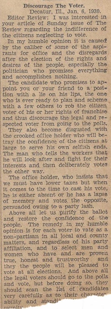 Every once in a while I come across a piece of writing that feels like it could have been written yesterday even though it’s nearly a century old. I have a newspaper clipping of a letter to the editor. The paper is unknown, but the comment is out of Decatur, Illinois, published January 6th, 1930.